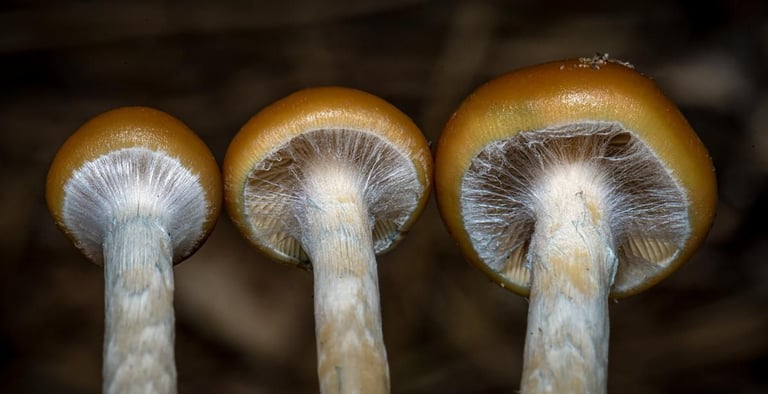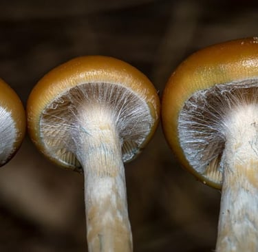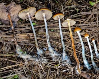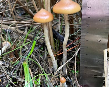 The cap can grow from 1-4” across. With a convex shape, slightly flattening with age yet keeping a pronounced umbo. It has a smooth surface that is viscous when wet, with a separatable pellicle. It has a brown chestnut color & is hygrophanous, producing a striated shading which fades to a light straw color. It bruises bluish black. The gills are brown, often darkening with age, with light to white edges. It can grow 4-8” tall & 0.2” thick. The stipe is white to brown in color and at the base there is often, rhizomorphic mycelium. Found in pockets of the Western coastal areas of US. It prefers sandy coastal soils associated with wood chips. Found from California to Oregon around late Oct to Feb. With up a tryptamine range of ~1-3% in dried specimens. Lookalikes Galerina marginata