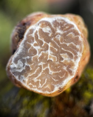 Interior (Gleba): White when immature, becoming marbled with thin white veins against a tan to medium brown background at maturity.